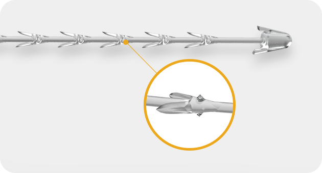 特殊高分子がPDO原糸を包んだDual-Layerd 3D Mambrane構造で、 コグの長さが深くて好きな部位に固定が可能で、特許を受けた モールディング工法で突出型外部構造(突起)の具現により優れた引 張力と固定力が立証され、強力なリフティング効果が期待できます。
