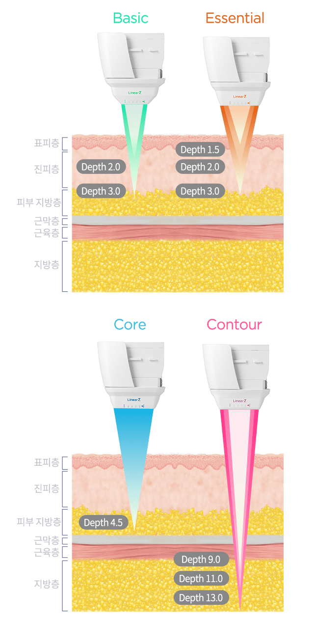 Linear(線タイプ)& Dot(点タイプ)2つのモードと様々な深さ の組み合わせを利用して、個人の顔型と肌の状態に 合わせたカスタマイズリフティング施術が可能です。