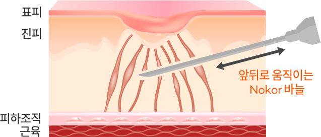 皮膚組織を下に引っ張っているコラーゲン繊維を断ち切るために、 真皮を切除して特殊針(Nokor needle)を注入します。